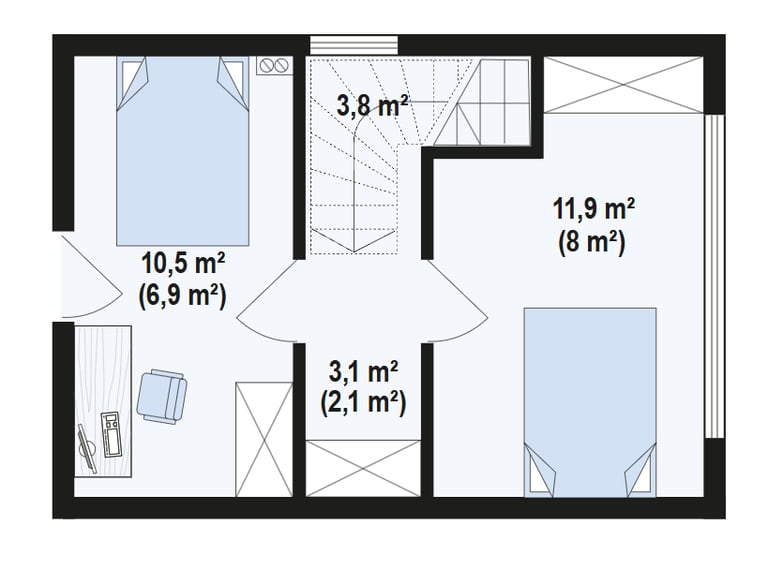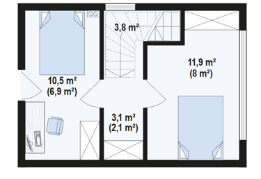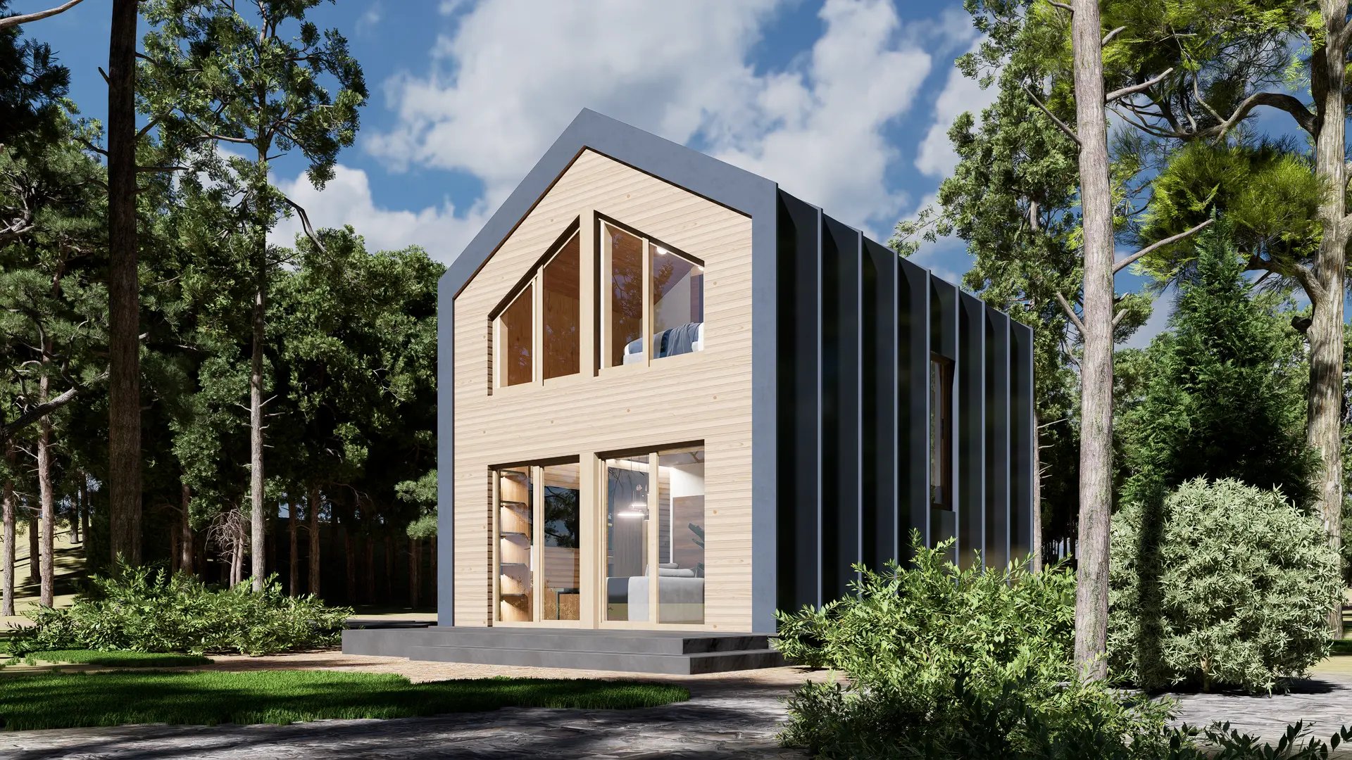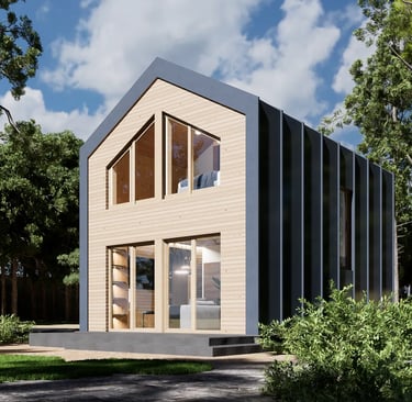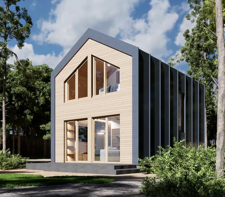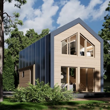 Dom Z455 30 D to nowoczesny, piętrowy dom drewniany o powierzchni 44 m². Jego kompaktowa, ale funkcjonalna przestrzeń obejmuje dwie sypialnie, co czyni go idealnym rozwiązaniem dla małej rodziny lub jako domek letniskowy. Charakterystyczna bryła budynku, z dużymi przeszkleniami i minimalistycznym designem, łączy estetykę z komfortem użytkowania.