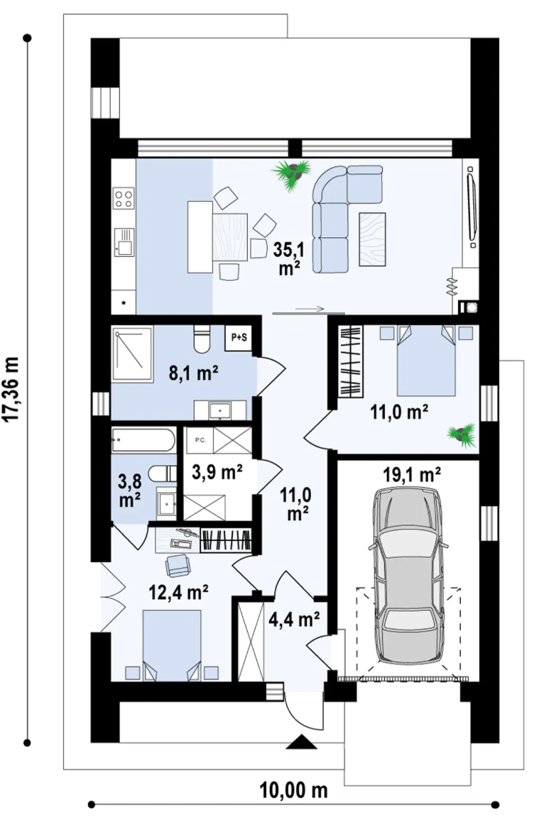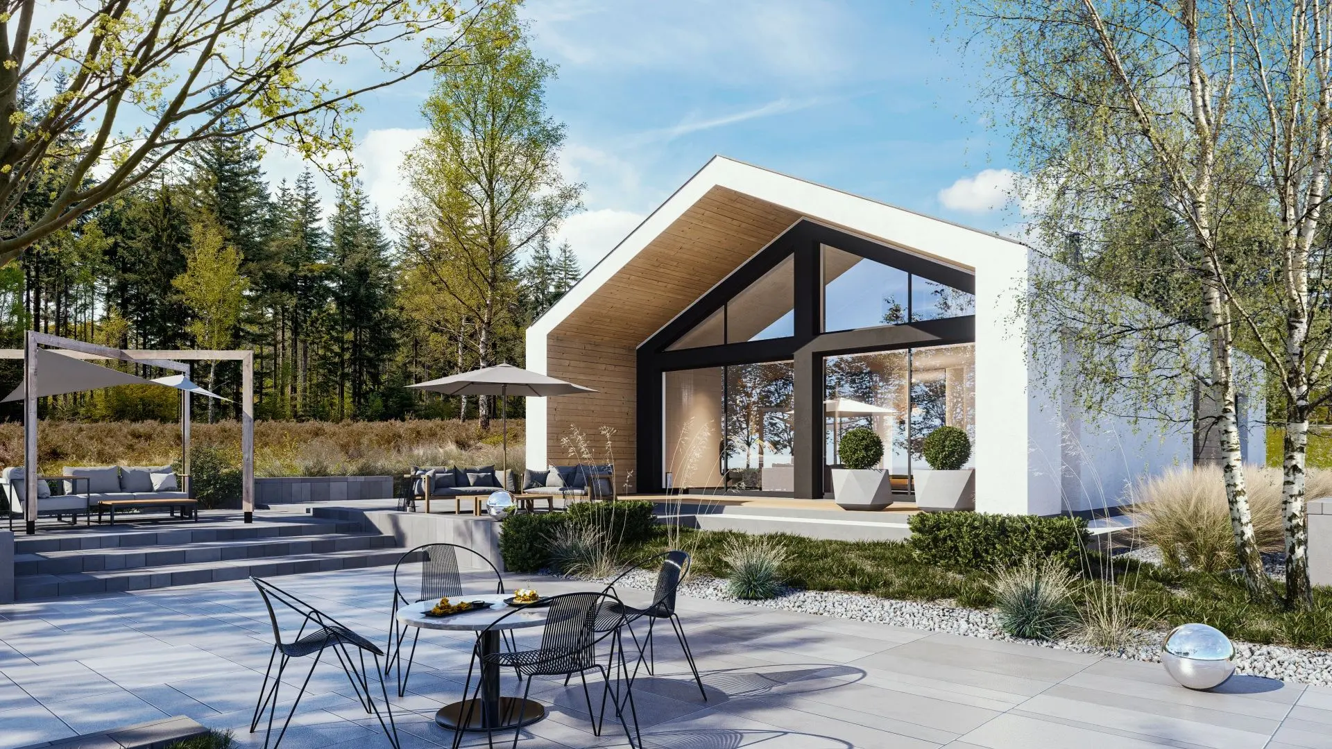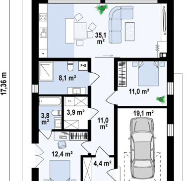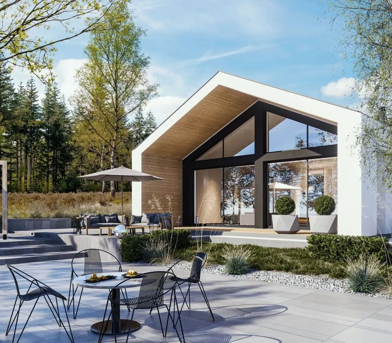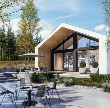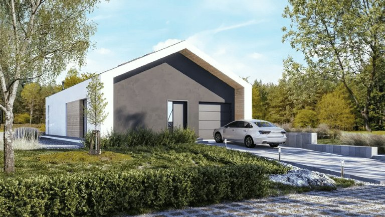 Z600 to nowoczesny, parterowy dom drewniany o powierzchni 86 + 19 m². Jego kompaktowa, ale funkcjonalna przestrzeń obejmuje dwie sypialnie, co czyni go idealnym rozwiązaniem dla małej rodziny lub jako domek letniskowy. Charakterystyczna bryła budynku, z dużymi przeszkleniami i minimalistycznym designem, łączy estetykę z komfortem użytkowania.